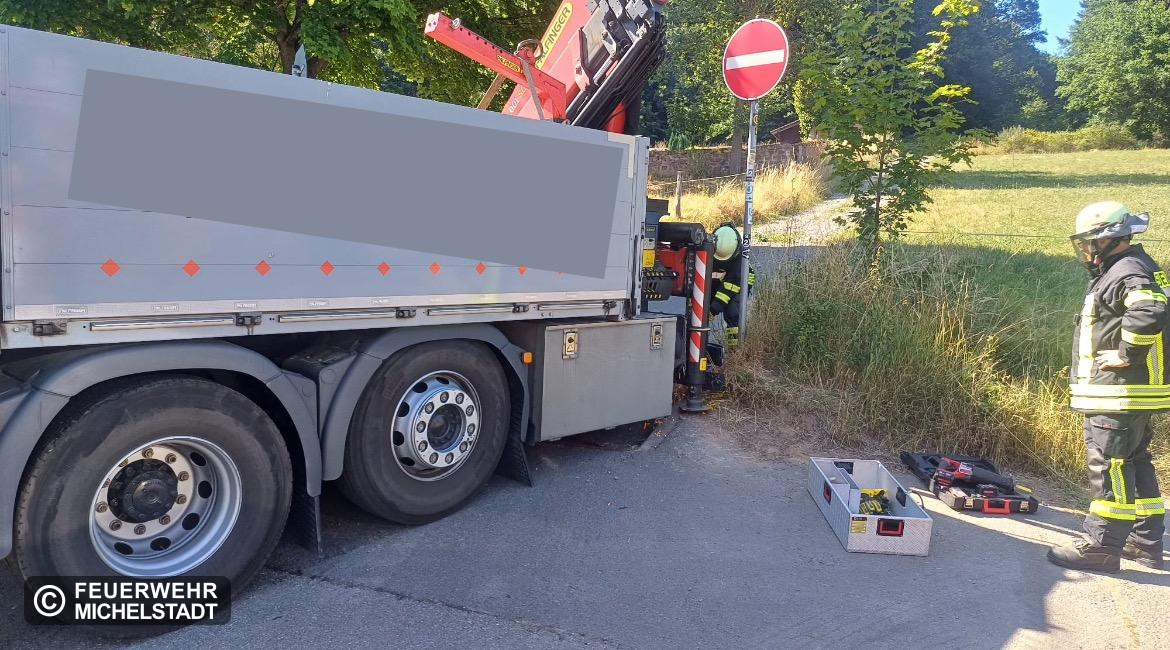 Ein LKW hatte sich in Höhe des Friedhofs Steinbuch bei der Ausfahrt auf die Kreisstraße festgefahren und blockierte die Kreisstraße. Durch uns wurde der Unterfahrschutz entfernt danach konnte der LKW seine Fahrt fortsetzen.