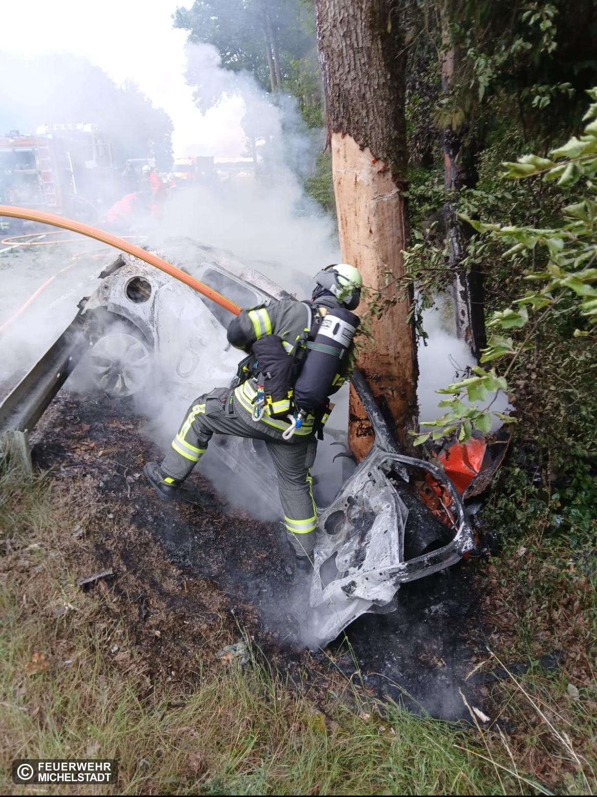 Gemeldet war ein brennender PKW nach einem Anprall an einem Baum auf der Strecke der B47 Eulbach Richtung Boxbrunn.