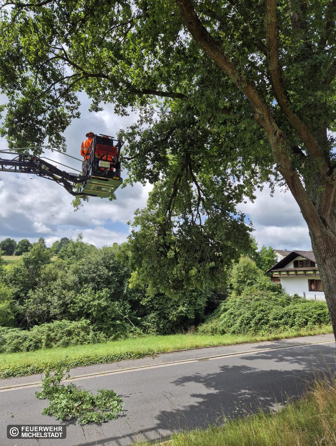 An einem Baum in Kirchbrombach war die Baumkrone angebrochen und drohte auf die Fahrbahn zu stürzen. Die Gefahrenstelle wurde durch die Besatzung der Drehleiter mit einer Motorsäge beseitigt. Im Anschluss reinigte die Feuerwehr Brombachtal die Fahrbahn, sodass die Straße wieder für den Verkehr freigegeben werden konnte.
