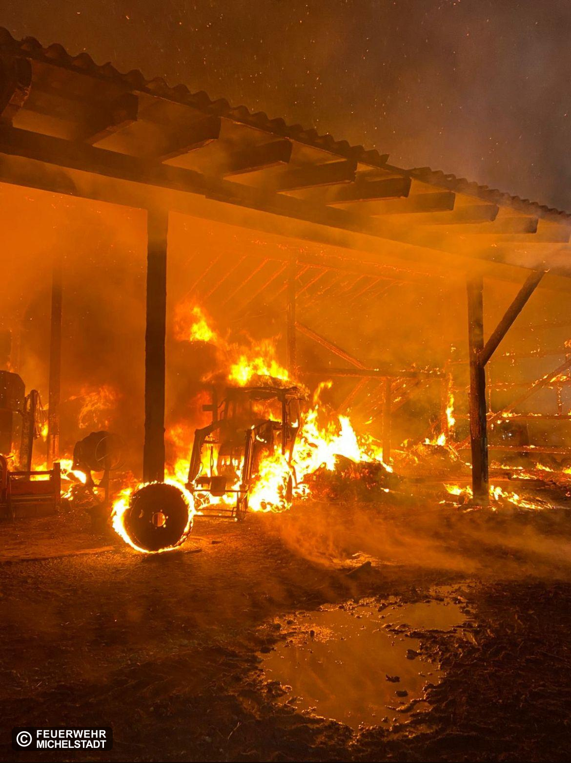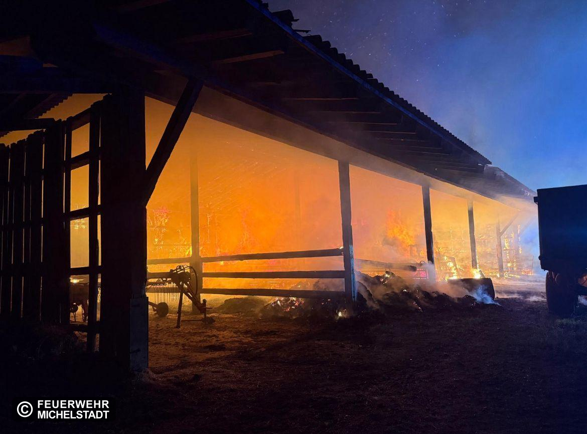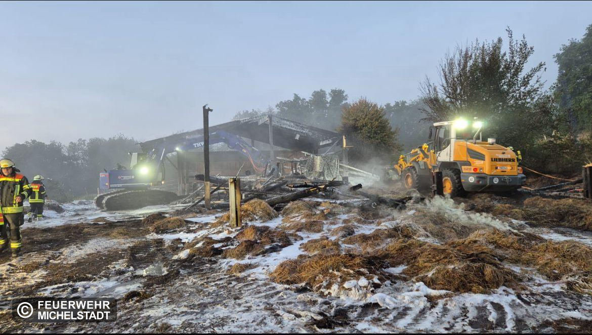 Um 23:04 Uhr wurde die Michelstädter Feuerwehr zu einem Brand einer landwirtschaftlichen Scheune alarmiert. Bereits auf der Anfahrt war zu erkennen, dass sich das Gebäude in Vollbrand befand. Umgehend wurde die Brandbekämpfung mittels drei C-Rohren, sowie über das Wenderohr der Drehleiter vorgenommen und ein Pendelverkehr für Löschwasser eingerichtet. Hier wurden neben dem Tanklöschfahrzeug aus Michelstadt auch die TLF´s der Feuerwehren Erbach und Bad König eingesetzt. Um weitere Atemschutzgeräteträger an der Einsatzstelle bereitzustellen, wurden die Feuerwehren Steinbach, Stockheim und Weiten-Gesäß nachalarmiert. Für ausreichend Atemschutzgeräte sorgte der Abrollbehälter Atemschutz der Feuerwehr Erbach, welche einen Abschnitt Logistik führte und sich hier auch um Nachschub von Verbrauchsmaterial und Verpflegung kümmerte. Um zunächst die eingesetzten Kräfte mit warmen Getränken zu versorgen, wurde die DRK-Bereitschaft Michelstadt alarmiert. Im Verlauf die Verpflegungsgruppe des DRK-Bad König, welche gemeinsam mit dem DRK-Höchst die Verpflegung sicherstellte. Das Gebäude musste zur Brandbekämpfung niedergelegt werden. Nachdem der Fachberater des THW Michelstadt an der Einsatzstelle eingetroffen war, wurde über die Leitstelle Odenwald die Fachgruppen Räumen des THW Groß- Gerau sowie Pfungstadt mit Kettenbagger und Radlader angefordert. Aufgrund des Einsatzes von Löschschaum war die Untere Wasserbehörde des Odenwaldkreises sowie der Wassermeister der Stadt Michelstadt an der Einsatzstelle. Insgesamt waren mit den Stadtbrandinspektoren, Kreisbranmeistern sowie dem Rettungsdienst 104 Einsatzkräfte im Einsatzgeschehen gebunden. Gegen 9 Uhr am Morgen, nach 10 Stunden Einsatz, konnten die Einsatzkräfte den Weg nach Hause antreten.