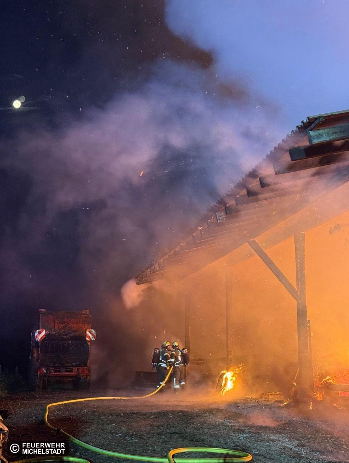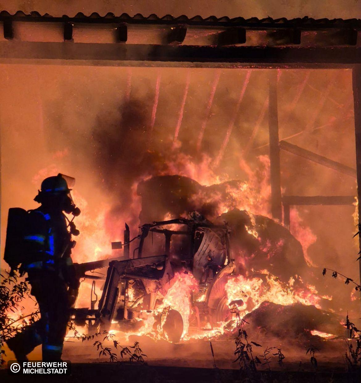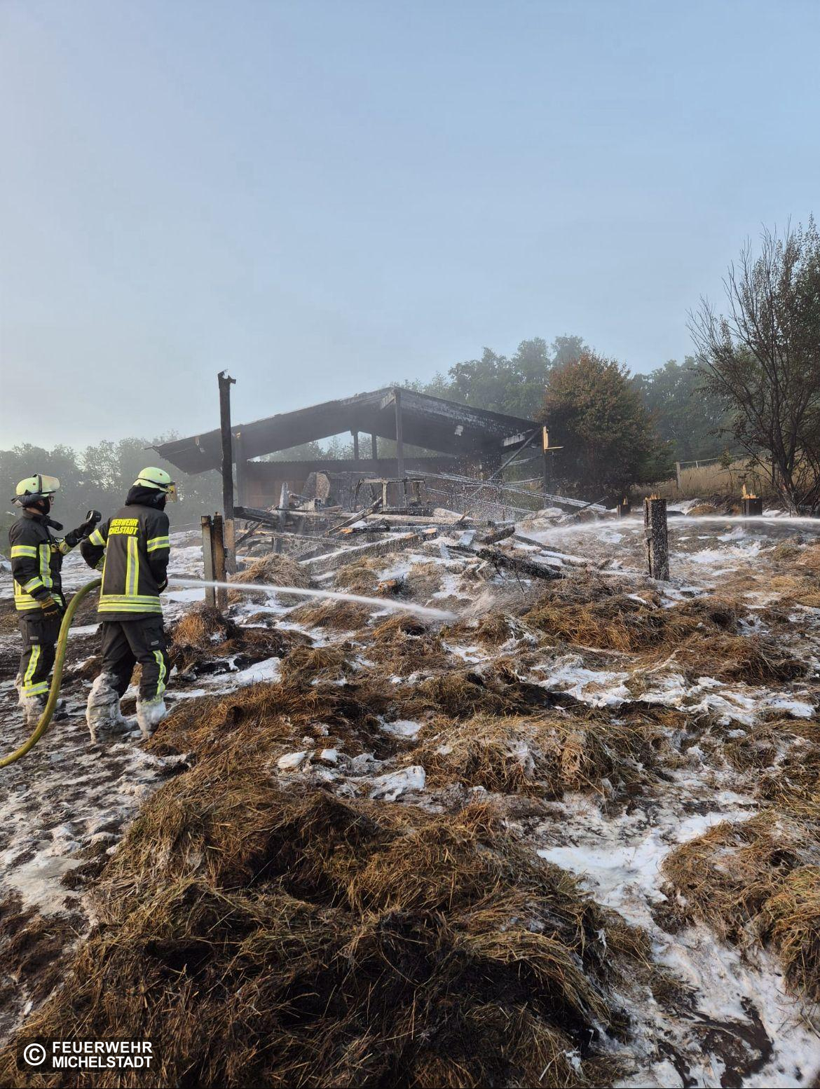 Um 23:04 Uhr wurde die Michelstädter Feuerwehr zu einem Brand einer landwirtschaftlichen Scheune alarmiert. Bereits auf der Anfahrt war zu erkennen, dass sich das Gebäude in Vollbrand befand. Umgehend wurde die Brandbekämpfung mittels drei C-Rohren, sowie über das Wenderohr der Drehleiter vorgenommen und ein Pendelverkehr für Löschwasser eingerichtet. Hier wurden neben dem Tanklöschfahrzeug aus Michelstadt auch die TLF´s der Feuerwehren Erbach und Bad König eingesetzt. Um weitere Atemschutzgeräteträger an der Einsatzstelle bereitzustellen, wurden die Feuerwehren Steinbach, Stockheim und Weiten-Gesäß nachalarmiert. Für ausreichend Atemschutzgeräte sorgte der Abrollbehälter Atemschutz der Feuerwehr Erbach, welche einen Abschnitt Logistik führte und sich hier auch um Nachschub von Verbrauchsmaterial und Verpflegung kümmerte. Um zunächst die eingesetzten Kräfte mit warmen Getränken zu versorgen, wurde die DRK-Bereitschaft Michelstadt alarmiert. Im Verlauf die Verpflegungsgruppe des DRK-Bad König, welche gemeinsam mit dem DRK-Höchst die Verpflegung sicherstellte. Das Gebäude musste zur Brandbekämpfung niedergelegt werden. Nachdem der Fachberater des THW Michelstadt an der Einsatzstelle eingetroffen war, wurde über die Leitstelle Odenwald die Fachgruppen Räumen des THW Groß- Gerau sowie Pfungstadt mit Kettenbagger und Radlader angefordert. Aufgrund des Einsatzes von Löschschaum war die Untere Wasserbehörde des Odenwaldkreises sowie der Wassermeister der Stadt Michelstadt an der Einsatzstelle. Insgesamt waren mit den Stadtbrandinspektoren, Kreisbranmeistern sowie dem Rettungsdienst 104 Einsatzkräfte im Einsatzgeschehen gebunden. Gegen 9 Uhr am Morgen, nach 10 Stunden Einsatz, konnten die Einsatzkräfte den Weg nach Hause antreten.