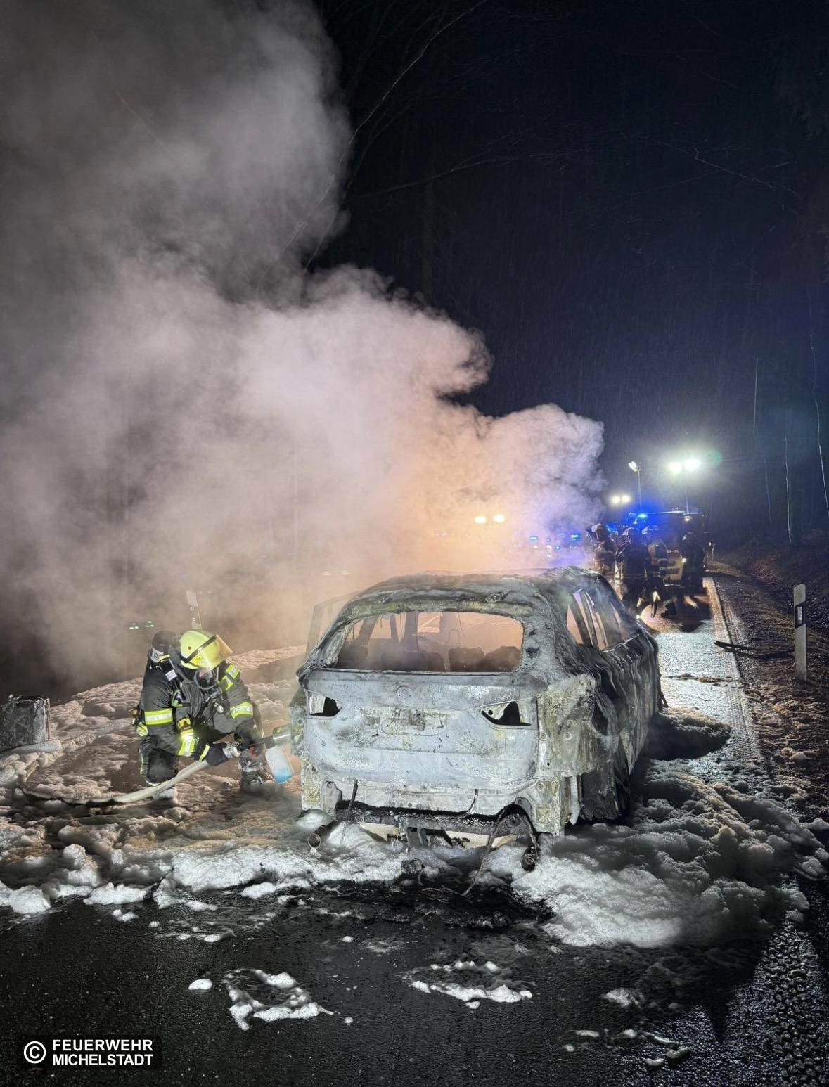 Gemeinsam mit der Feuerwehr Rehbach wurde der Fahrzeugbrand bekämpft und die Einsatzstelle abgesichert und ausgeleuchtet.