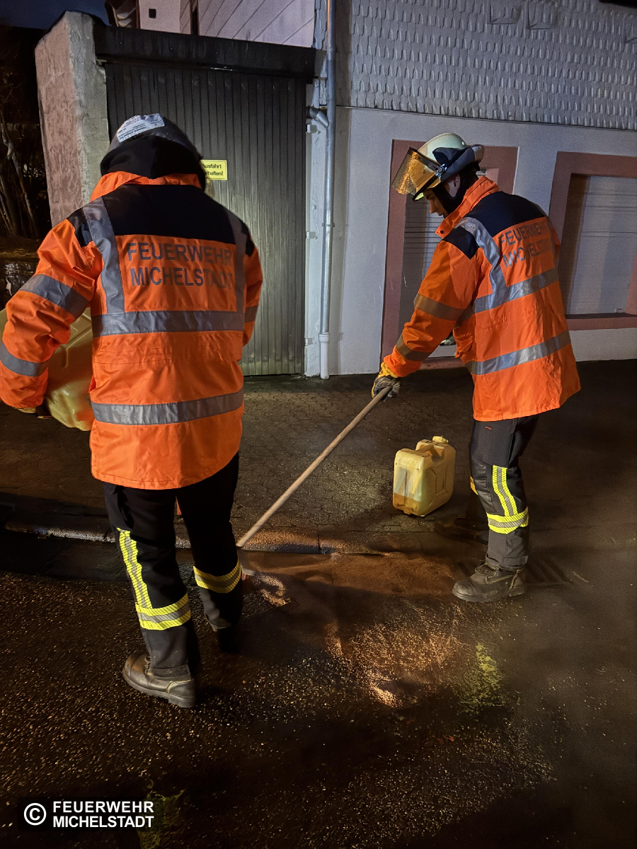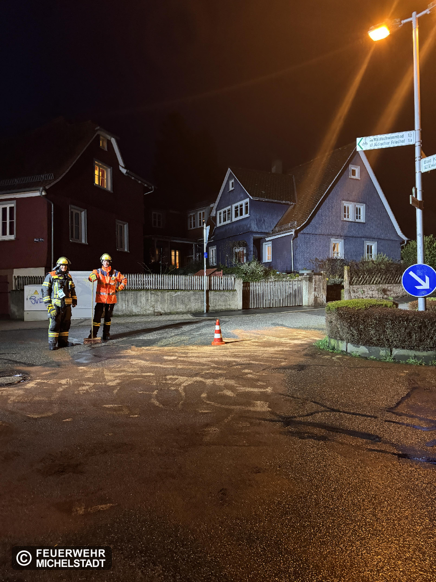 Es wurde eine sich von der Jahnstraße bis zur Waldstraße verlaufende Benzinspur von einem Anrufer gemeldet, welche bereits in die Gullis zu laufen drohte. Vor Ort bestätigte sich die Lage, die Spur wurde mittels Ecoperl abgestreut, weiteres Einlaufen in die Gullis konnte größtenteils verhindert werden. Abschließend wurden noch Warnschilder aufgestellt.